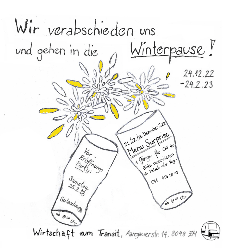 Mittwoch 21.12. bis Freitag 23.12.22: Abschlusswoche mit 4-Gang-Menu «surprise» für 40 Fr. Bitte reserviert rechtzeitig und mit Angabe, ob Ihr die Fleisch- oder die Vegi-Variante möchtet. Ab 18 Uhr.